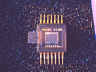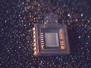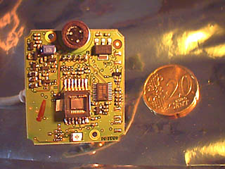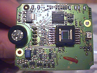 the PCB is free. Operate under ESD save conditions ! Now we have to desolder the CCD. Protect it's surface with a piece of adhesive tape. Remove as much solder as possible from the pins with desoldering-wire. Then use a needle as a lever to gently lift the pins while heating them - they will snap of their pads with a little "click". If all pins are desoldered properly the CCD will fall of the board by itself. Don't force it!